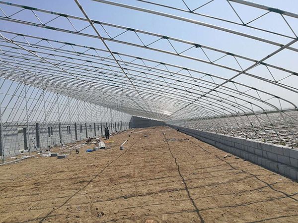日光温室通常采用砖墙式,温室骨架采用热镀锌型材,覆盖材料以po薄膜为主、以pc阳光板、玻璃覆盖为辅助材料;温室配套安装保温系统、通风系统、卷帘系统、风机湿帘降温系统、配电系统等设施,具有方便使用,操作简单等特点;温室安装普通门或推拉门(温室尺寸及配套设施根据实际需要选择)。日光温室建设施工分砖墙部分跟温室建设两个部分:首先土地经过平整后进行砖墙施工作业,砖墙建设时端面预留洞口(安装门、风机湿帘),后墙留有洞口(安装推拉窗);温室建设部分由骨架建设、覆盖材料以及保温系统、配电系统等配套设施按顺序施工作业;温室一端面建设尖顶房或平房一间,留作管理值班室以及放置工具、设备使用!
